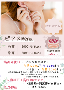 木曜日の午後・日曜日は、ピアスの施術ができませんのでご来院の際お気をつけください!